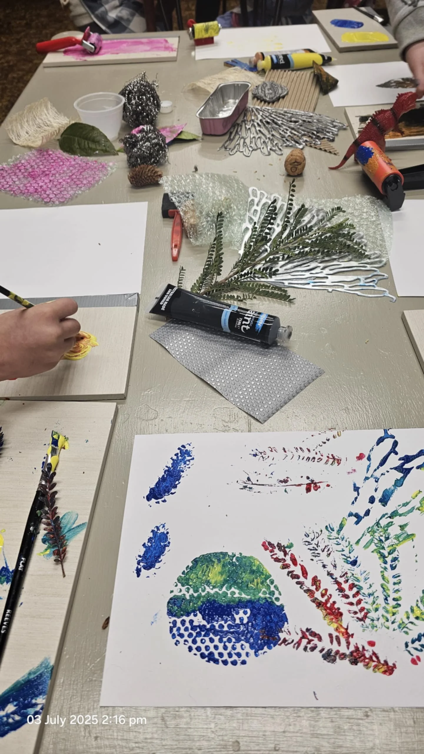 We’re going to dive into printmaking again but this time making a printing “plate” from cardboard and other materials for texture. This could be a real picture or just abstract shapes and lines. Children will need to confident with scissors.