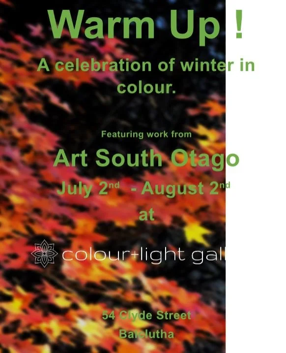Join us at Colour + Light Gallery in Balclutha for Warm Up, a vibrant group exhibition featuring works by Art South Otago artists. This colourful winter showcase runs from Wednesday 2 July, 4:00 PM to Saturday 2 August, 2:00 PM — a celebration of creativity, warmth, and seasonal inspiration through art.